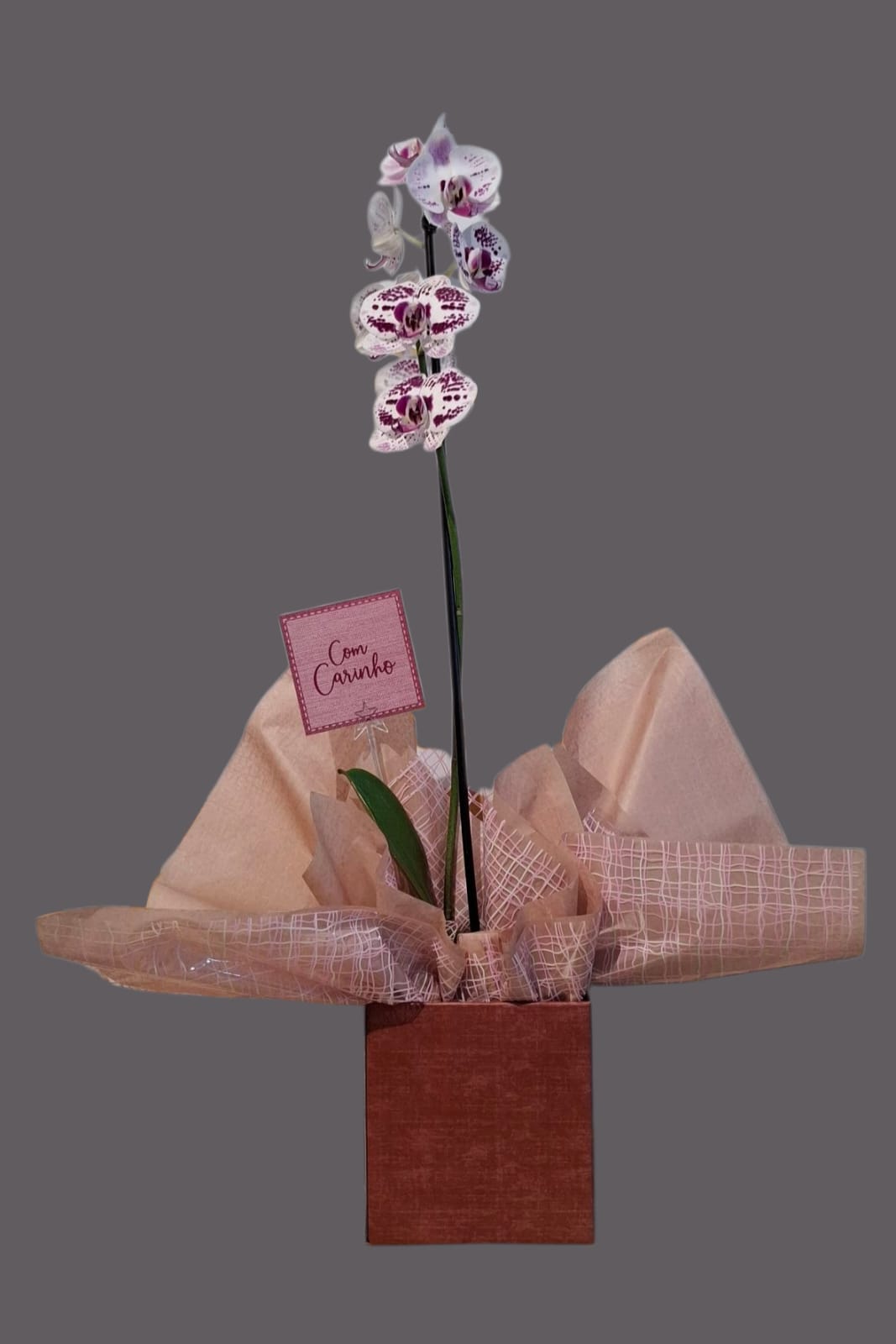 Um presente delicado e elegante para diversos momentos da vida. Um belo arranjo de orquídeas phalaenopsis, acompanha cartão e embrulho